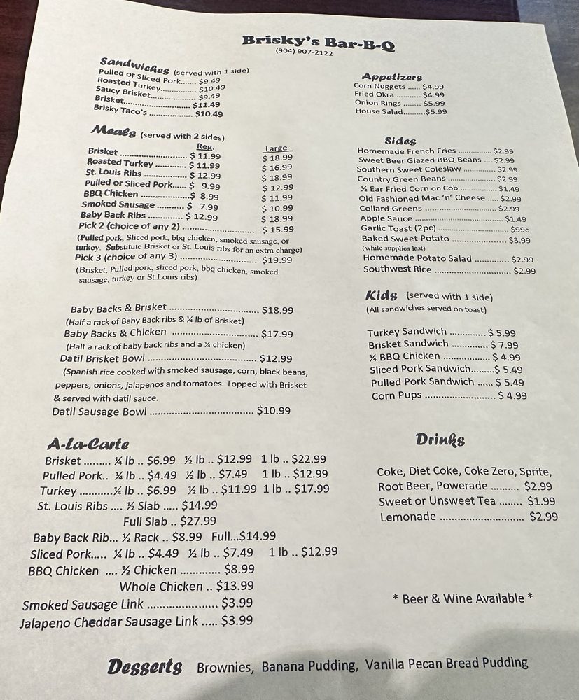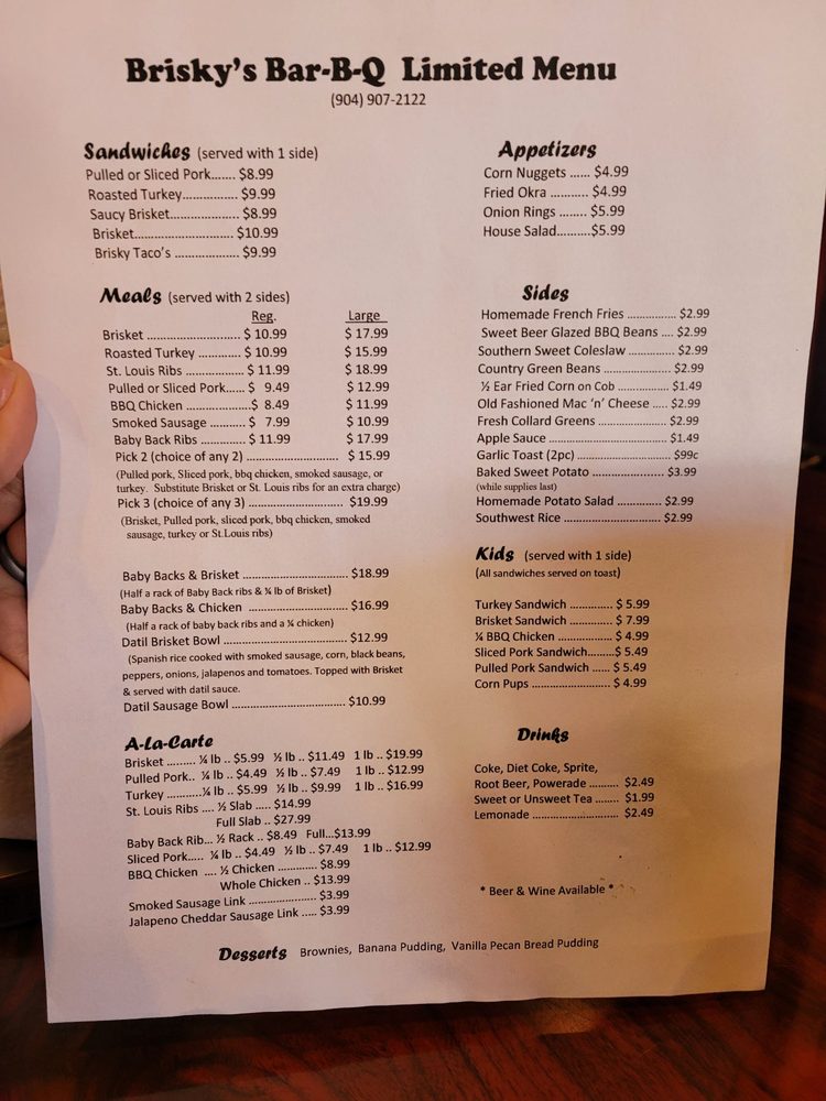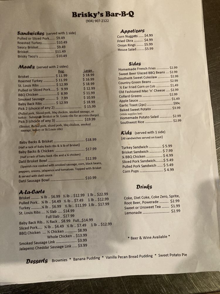 Feast upon the mouthwatering offerings at Brisky's Family style BBQ, located in St. Augustine, FL. This casual and friendly establishment offers a variety of barbeque dishes, with highlights including their juicy brisket, tender pulled pork, and flavorful smoked sausage. Customers rave about the delicious BBQ beans, creamy Mac n cheese, and heavenly banana pudding. The staff at Brisky's are praised for their warmth and efficiency, adding to the overall dining experience. With a spacious dining area, accommodating staff, and a menu filled with delectable options, Brisky's Family style BBQ is the perfect spot for a satisfying meal with family and friends. Don't miss out on the opportunity to savor the true flavors of BBQ at Brisky's.